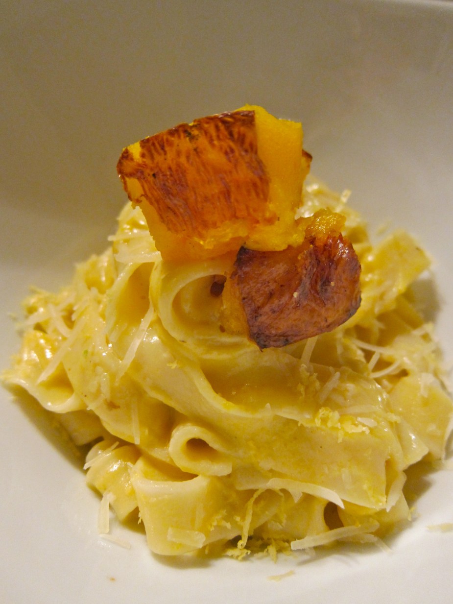 Pappardelle tossed with a cream sauce that was blended with roasted butternut squash. Topped with cubed squash, a dash of parmesan, and fresh grated lemon zest.