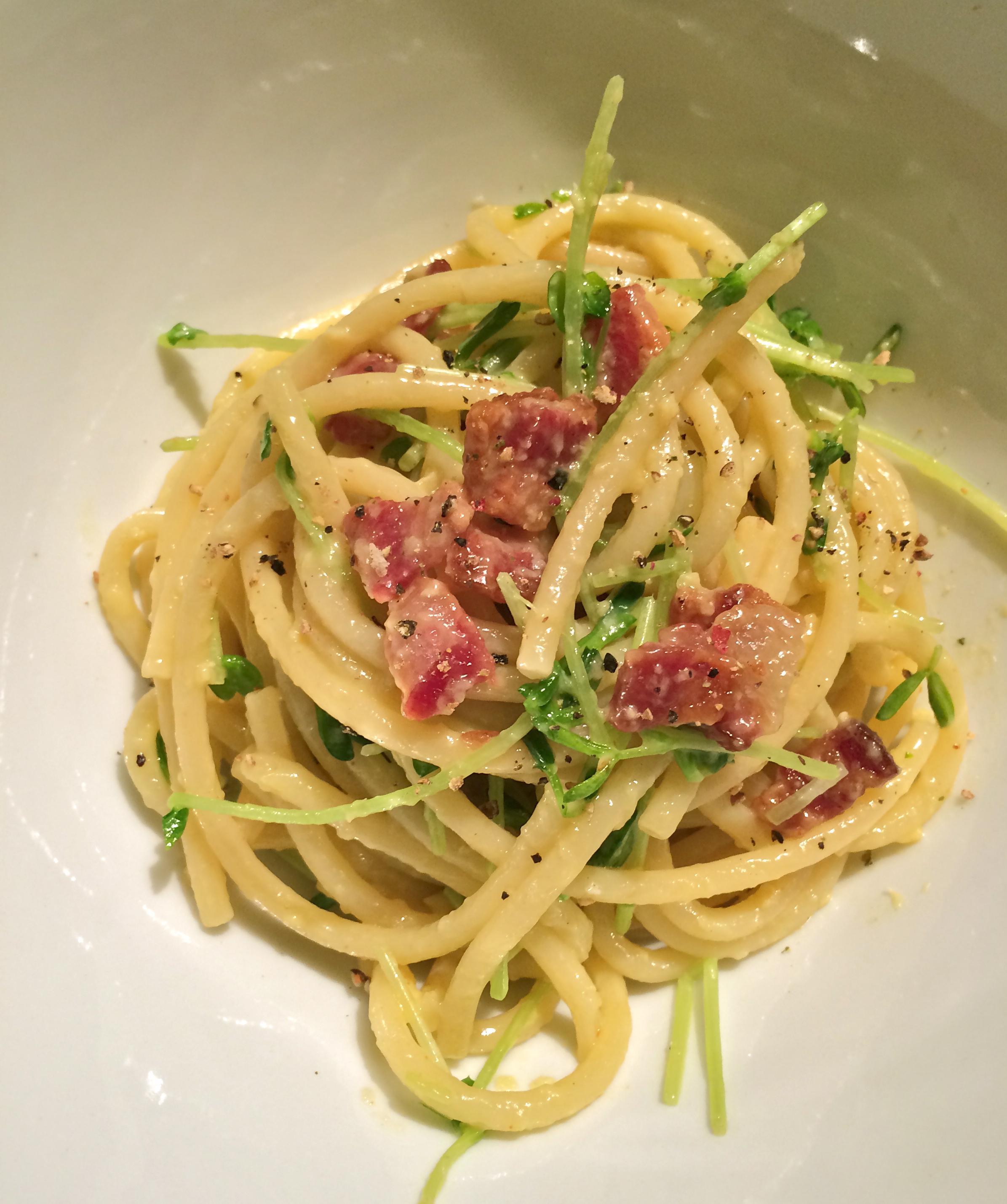 Bucatini Carbonara with Pea Shoots