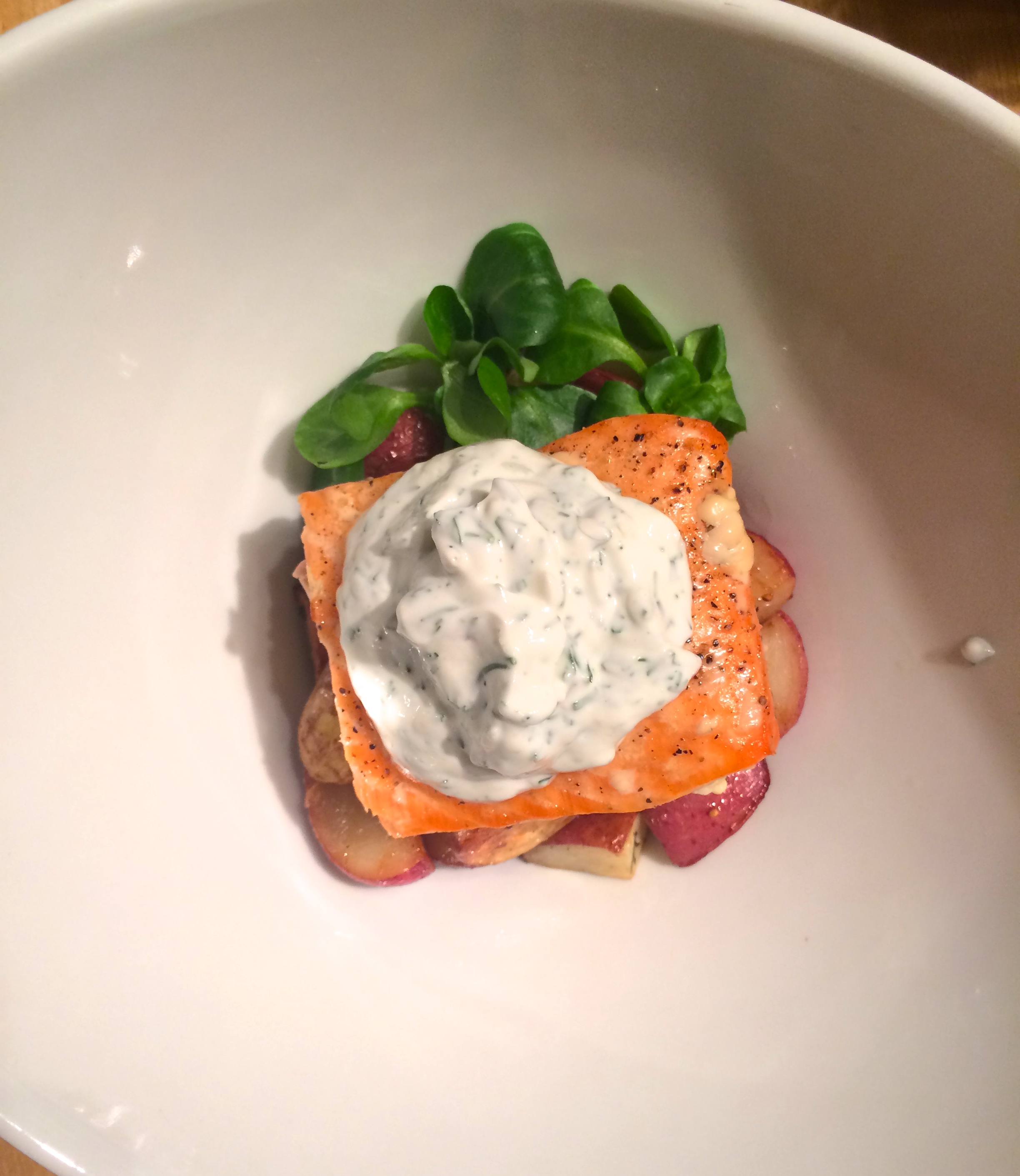 I began with chopped baby red and fingerling potatoes tossed with olive oil, S+P and then roasted until crispy around the edges. A few minutes before they were done, I tossed them with a splash of apple cider vinegar and some sliced shallots, and then put them back in for five minutes or so. The salmon was cooked in the oven over a cedar plank with salt and pepper, just until the edges started to deepen in color and crisp up. The yogurt sauce is for sure the star of this dish. I walked over to the dairy aisle at the store and came upon siggi’s Icelandic-style cream-skyr. I mixed this up with some fresh cracked pepper, garlic, sea salt, and heaps of dill and it went on the salmon right out of the oven.